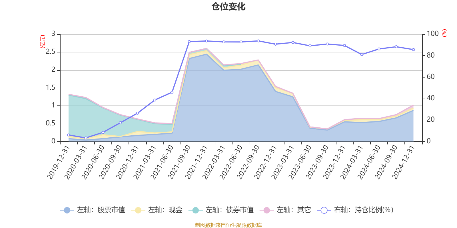 据定期报告数据统计,近三年平均股票仓位为89.43%,同类平均为79.89%。2022年三季度末基金达到93.75%的最高仓位,2020年一季度末最低,为3.33%。