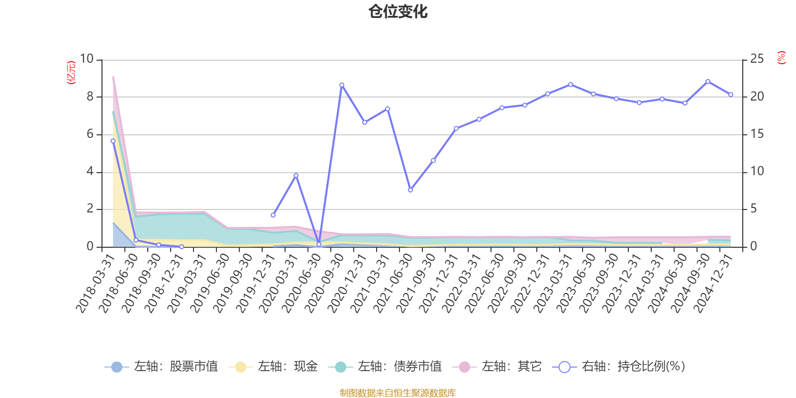 据定期报告数据统计,近三年平均股票仓位为19.8%,同类平均为18.69%。2024年三季度末基金达到22.09%的最高仓位,2018年末最低,为0.04%。